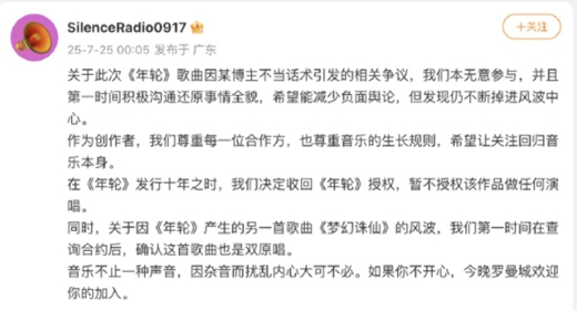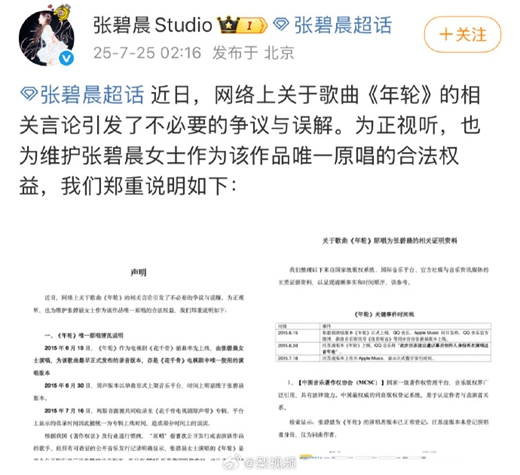 就在同一天凌晨,@张碧晨Studio也发布了声明。声明中明确指出,近日网络上关于歌曲《年轮》的相关言论引发了不必要的争议与误解。为了正视听,也为了维护张碧晨女士作为该作品唯一原唱的合法权益,他们郑重说明相关情况。这一声明,无疑是将矛盾进一步激化,让原唱之争变得更加白热化。